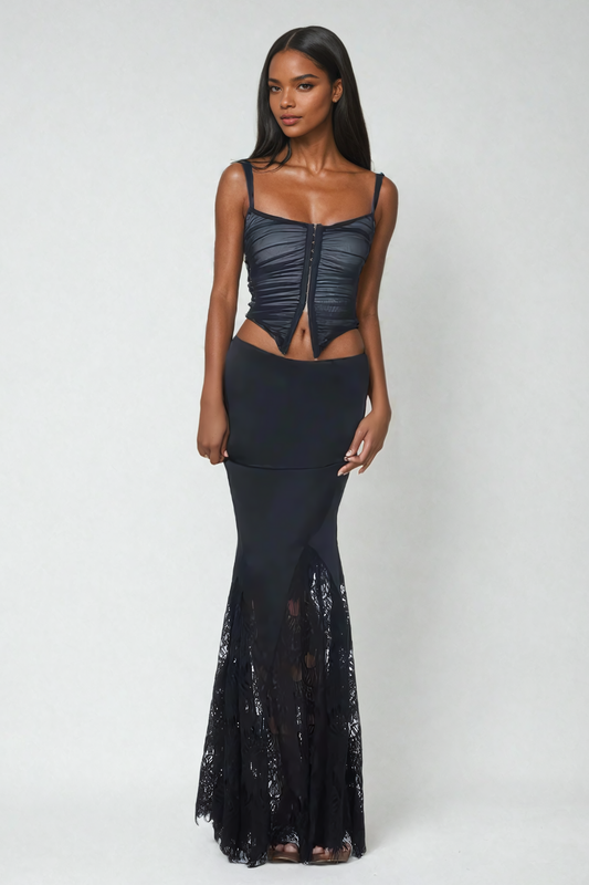Ailish Sırtı Açık Çiçek Dantelli Siyah Maxi Elbise