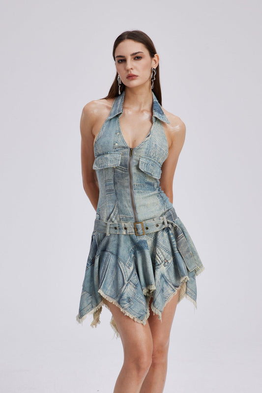 42% İndirimChava Halter Yaka Baskılı Saçaklı Mini Elbise