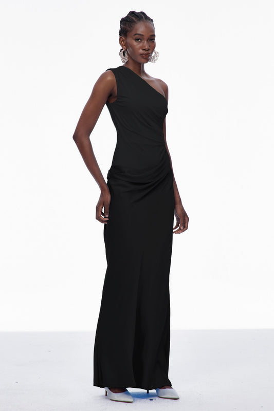 49% İndirimBeres Tek Omuzlu Siyah Saten Uzun Elbise