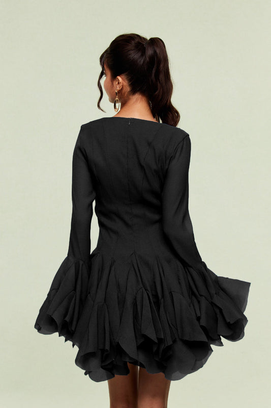 50% İndirimSiyah Ebere Fileli Volanlı Mini Elbise