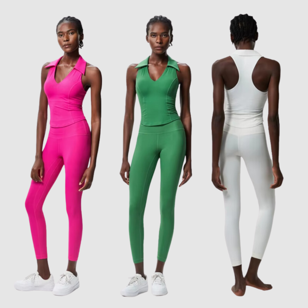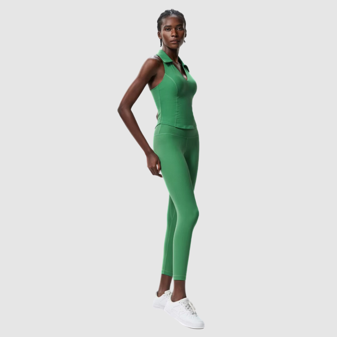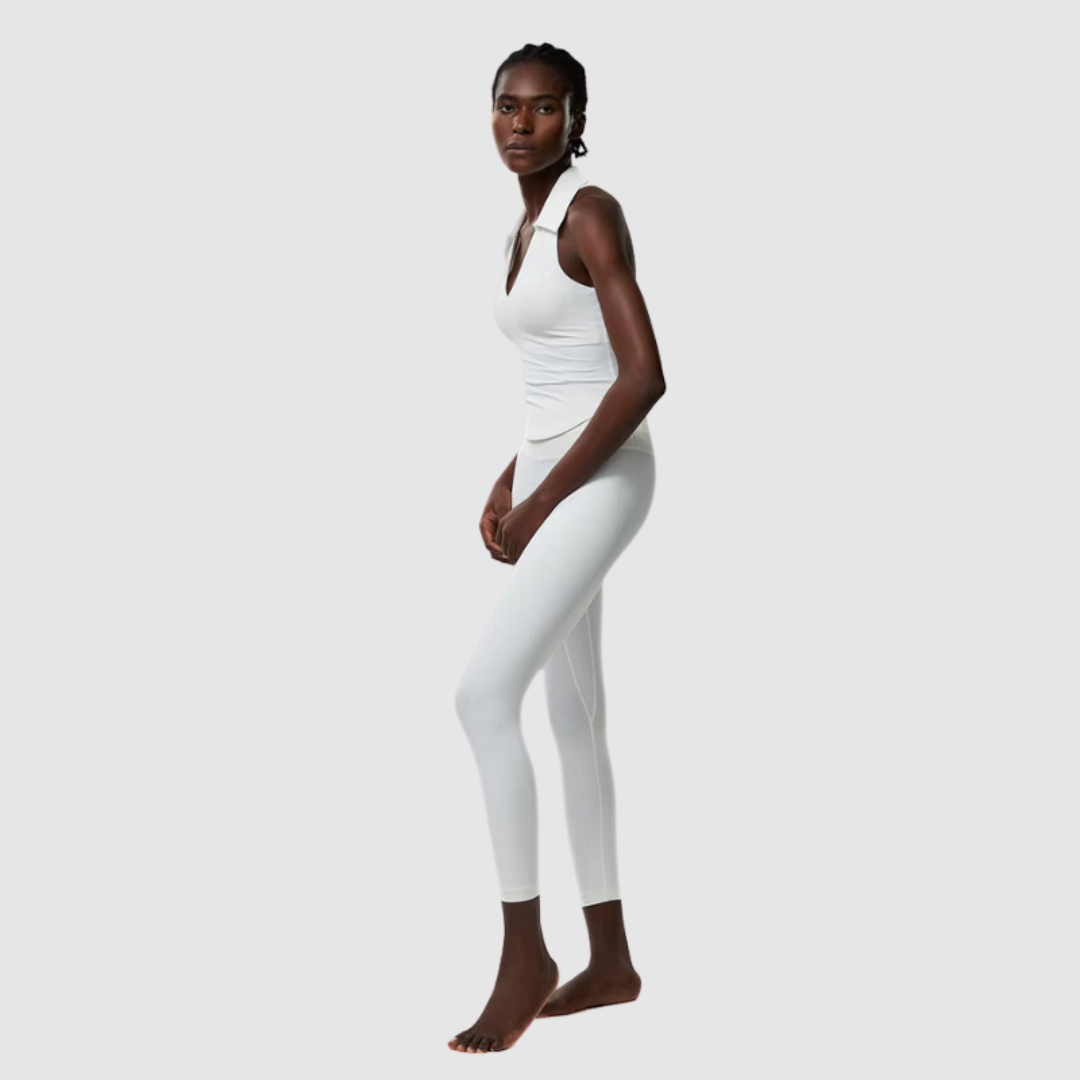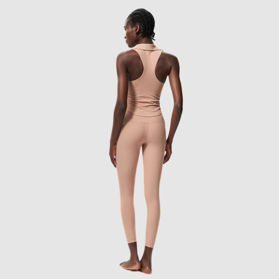 Bu iki parçalı nervürlü spor giyim seti, hem antrenmanlar hem de günlük kullanım için şık ve çok yönlü bir çözüm sunar. Yakalı üst ve yüksek belli tayttan oluşan özel tasarım, şıklığı işlevsellikle bir araya getirerek yoga, pilates veya şık bir spor şıklığı için mükemmel bir seçimdir.