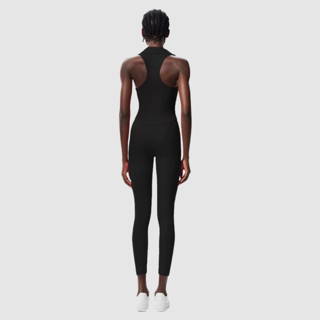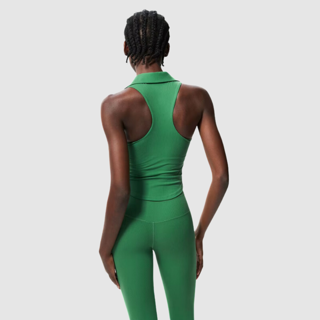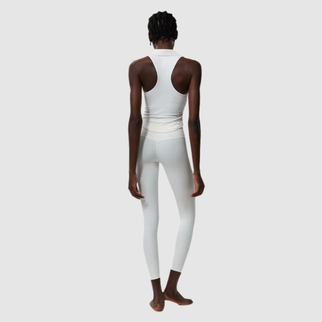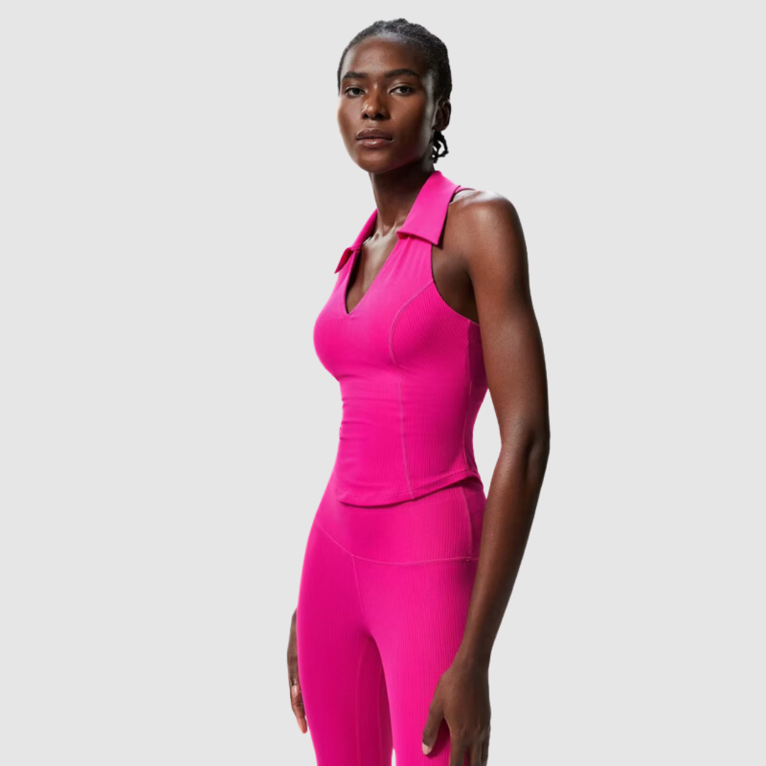 Bu iki parçalı nervürlü spor giyim seti, hem antrenmanlar hem de günlük kullanım için şık ve çok yönlü bir çözüm sunar. Yakalı üst ve yüksek belli tayttan oluşan özel tasarım, şıklığı işlevsellikle bir araya getirerek yoga, pilates veya şık bir spor şıklığı için mükemmel bir seçimdir.