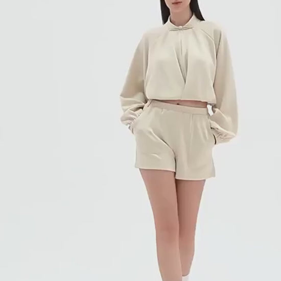 Bu Crop hırka, konfor ve zarafetin mükemmel bir karışımıdır. Drapeli ön kısmı ve büzgülü manşetleriyle, spor salonundan günlük kullanıma zahmetsizce geçiş sağlayan rahat ama şık bir görünüm sunar. Hafif ve nefes alabilen kumaş, gün boyu konfor sağlarken, düğme detaylı yüksek yaka, benzersiz ve sofistike bir dokunuş katar.